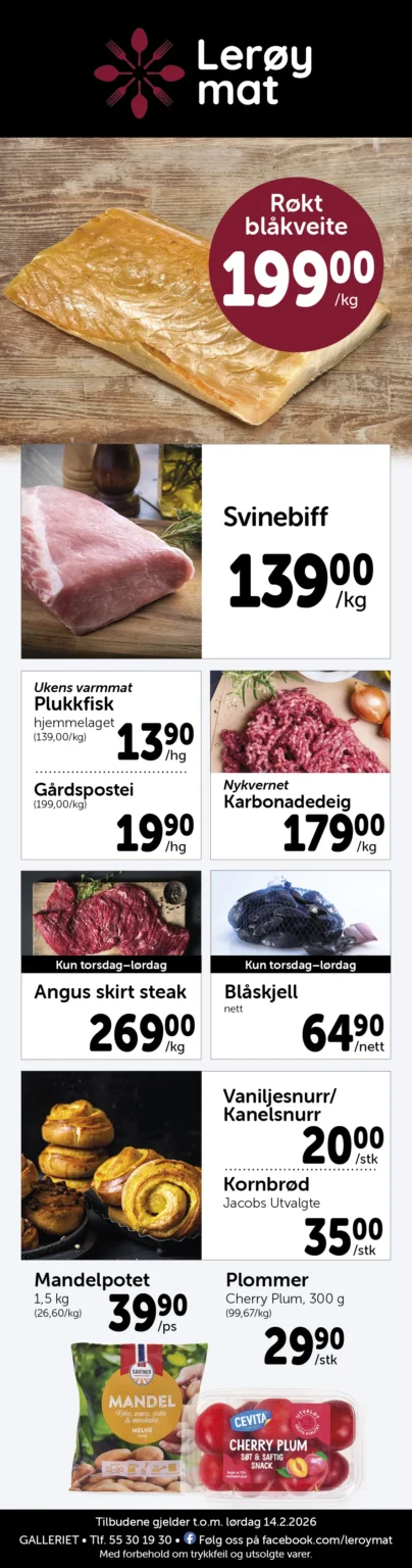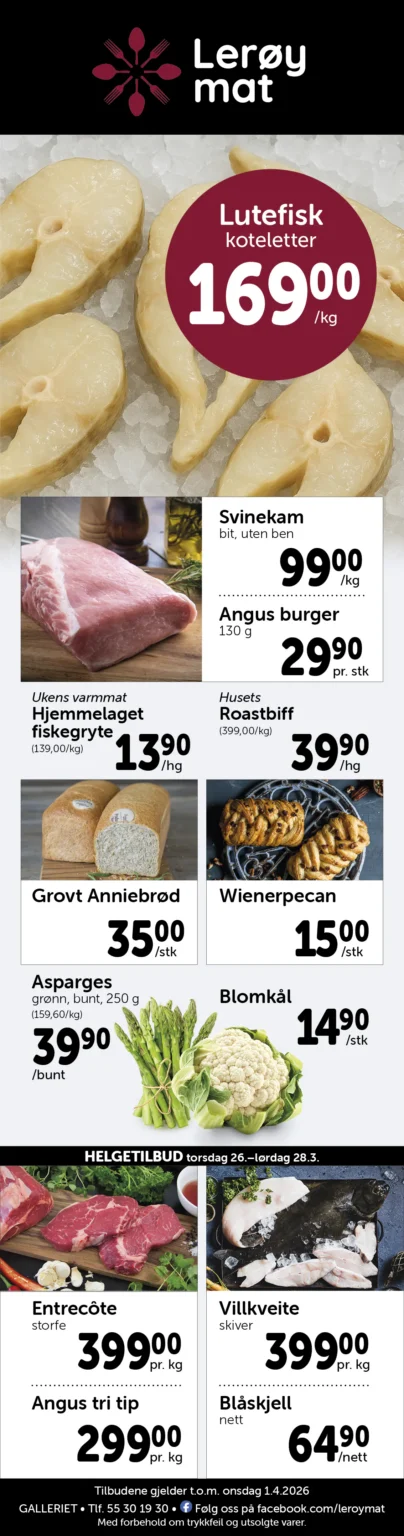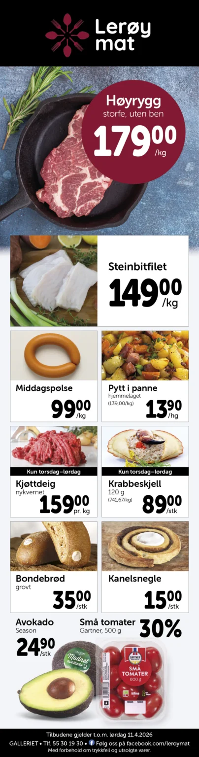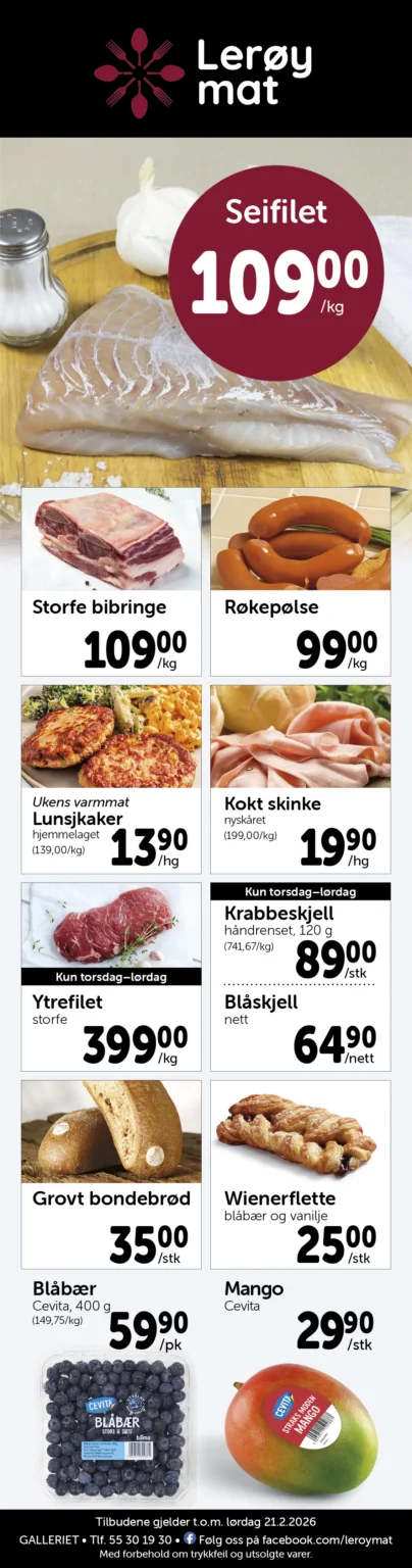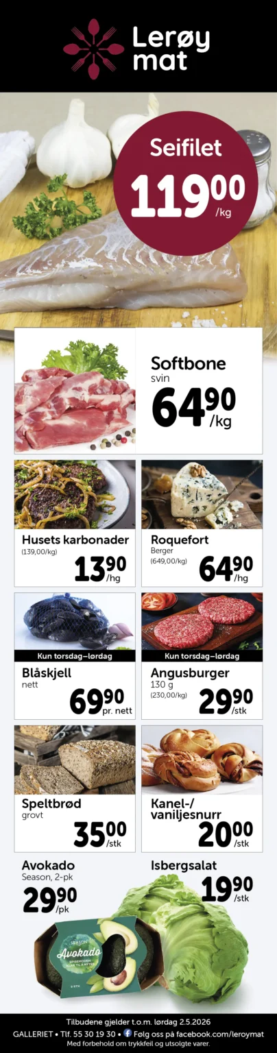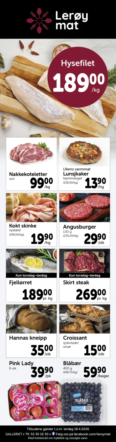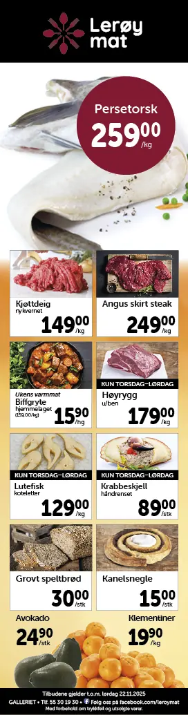 Lerøy Mat er en vel ansett matforretning med et raust utvalg av ferskvarer og spesialiteter, i tillegg til all vanlig dagligvare.