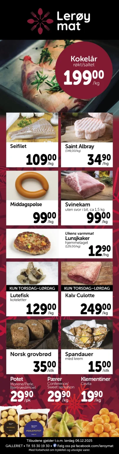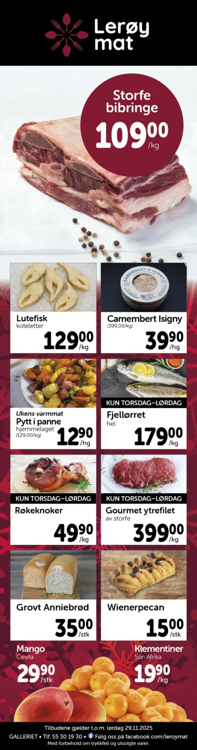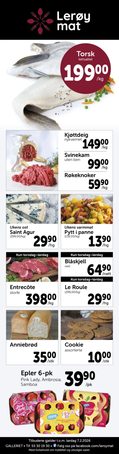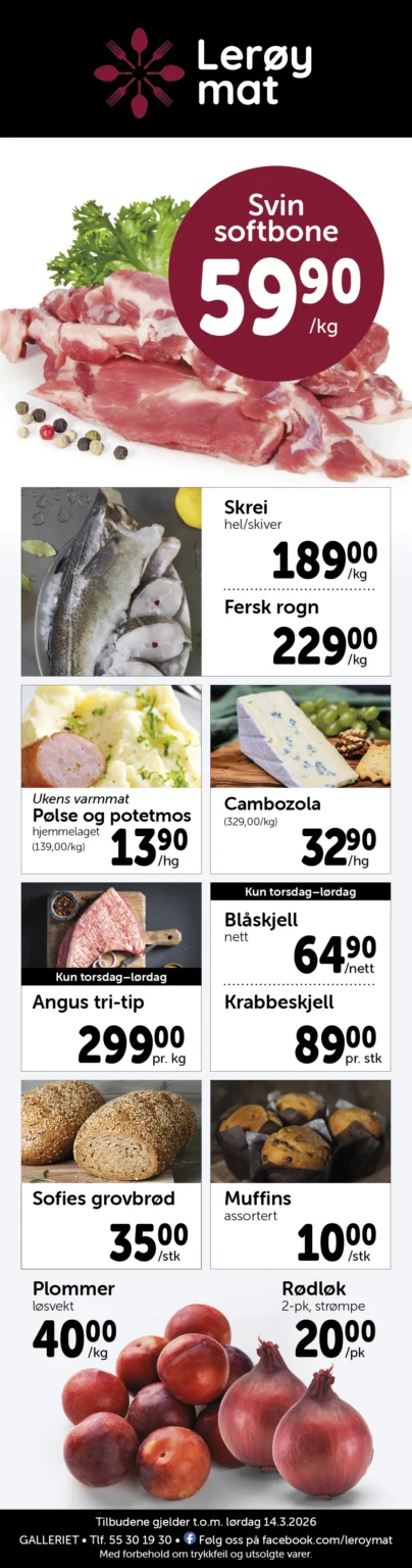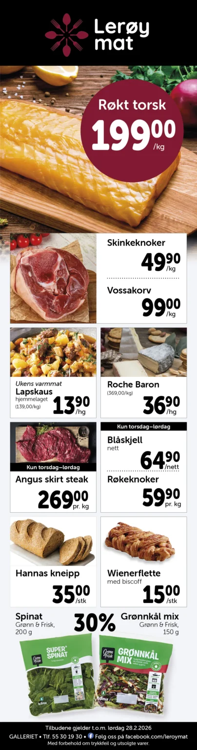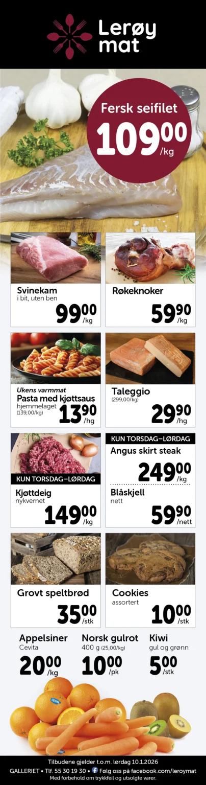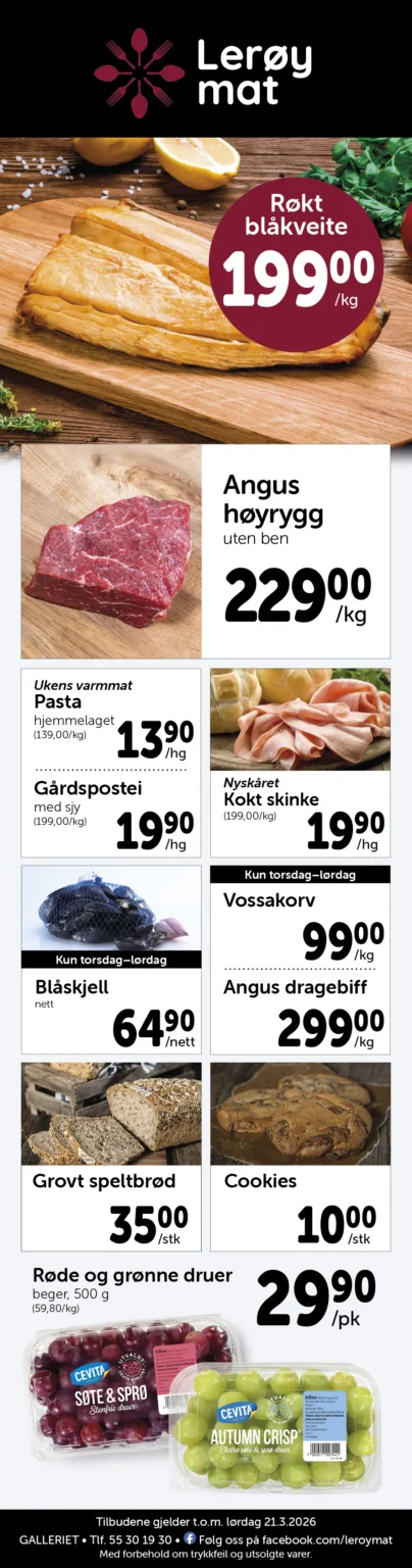 Lerøy Mat er en vel ansett matforretning med et raust utvalg av ferskvarer og spesialiteter, i tillegg til all vanlig dagligvare.